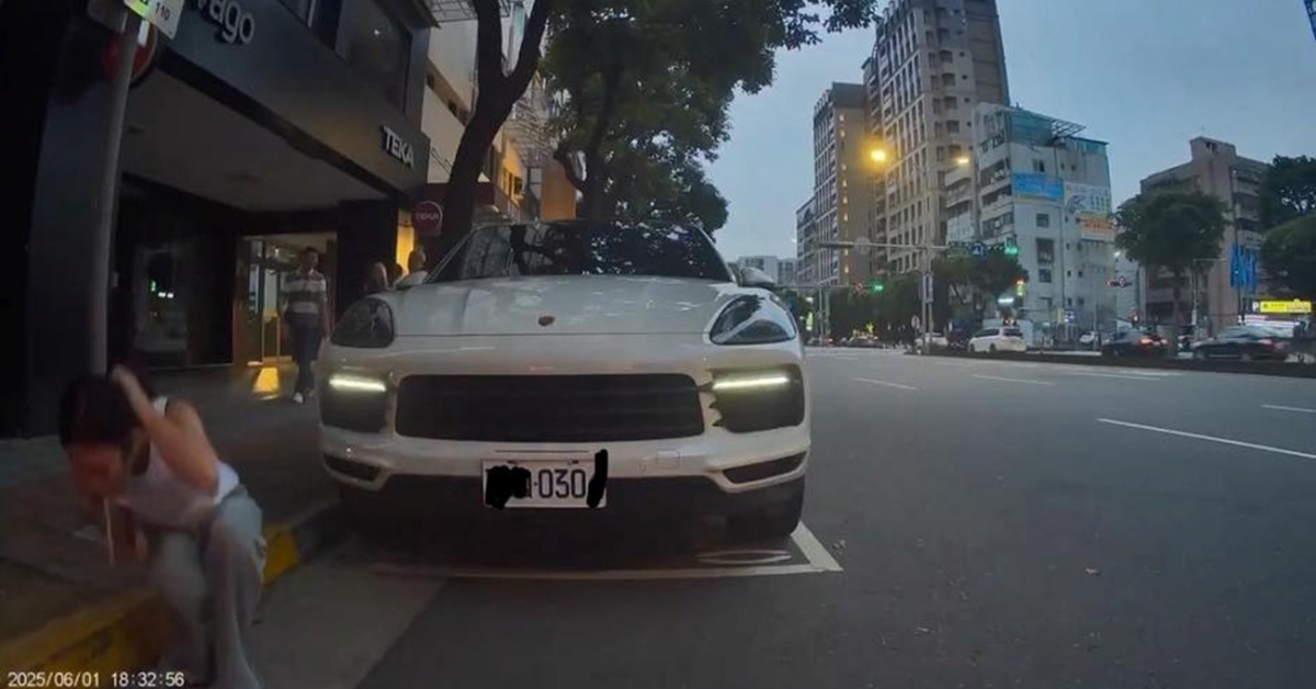 這段畫面是由行車紀錄器拍攝,時間為本月1日晚上6點左右,地點位於台北市民生東路三段與松江路交叉口的一處店面前。當時,一輛白色保時捷停在路邊車格內,接著一名長髮女子突然從車內下車,一邊撩起頭髮、一邊走向路旁的水溝,手中還提著包包。隨後,她蹲下身來,對著水溝吐出一大口白色液體。吐完後,女子若無其事地站起來,再度返回車內。