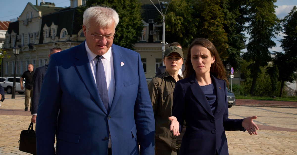 2025年8月7日星期四,羅馬尼亞外交部長瓦娜·托尤(右)和烏克蘭外交部長安德烈·西比哈在烏克蘭基輔會晤時交談。(圖/翻攝自美聯社)