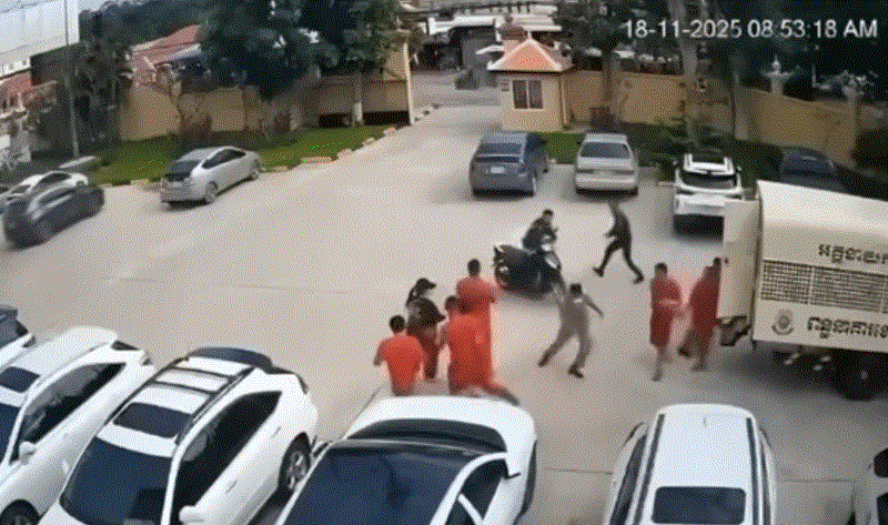 柬埔寨斯雷省法院18日上演一起膽大妄為的白日越獄戲碼。1名遭收押的黑幫老大在法院外突然取得槍枝,當街攻擊獄警後逃離現場,整個過程被監控鏡頭完整捕捉,震驚當地社會
