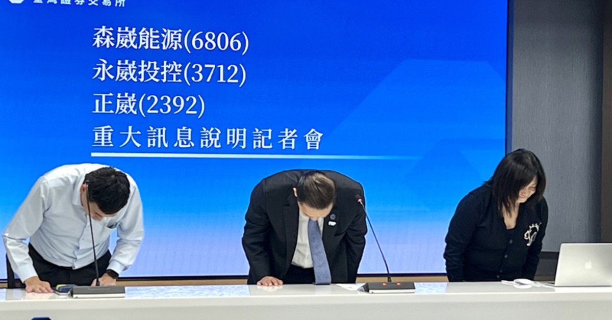 森崴能源總經理胡惠森(中)向投資人道歉,並宣布請辭。(圖/中央社提供)